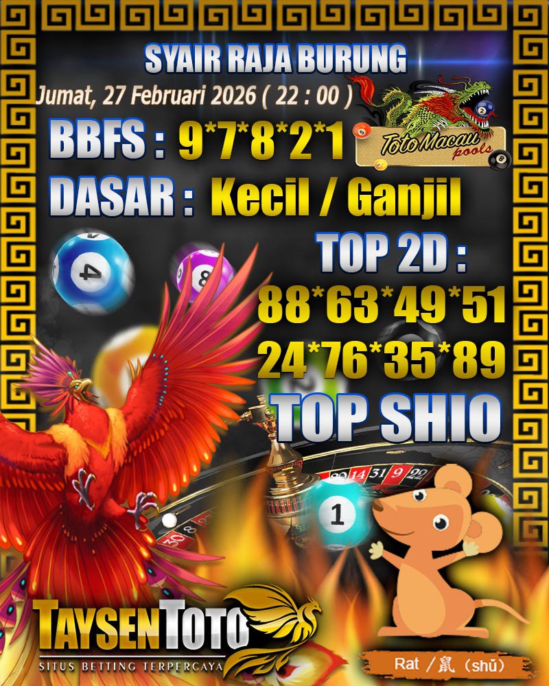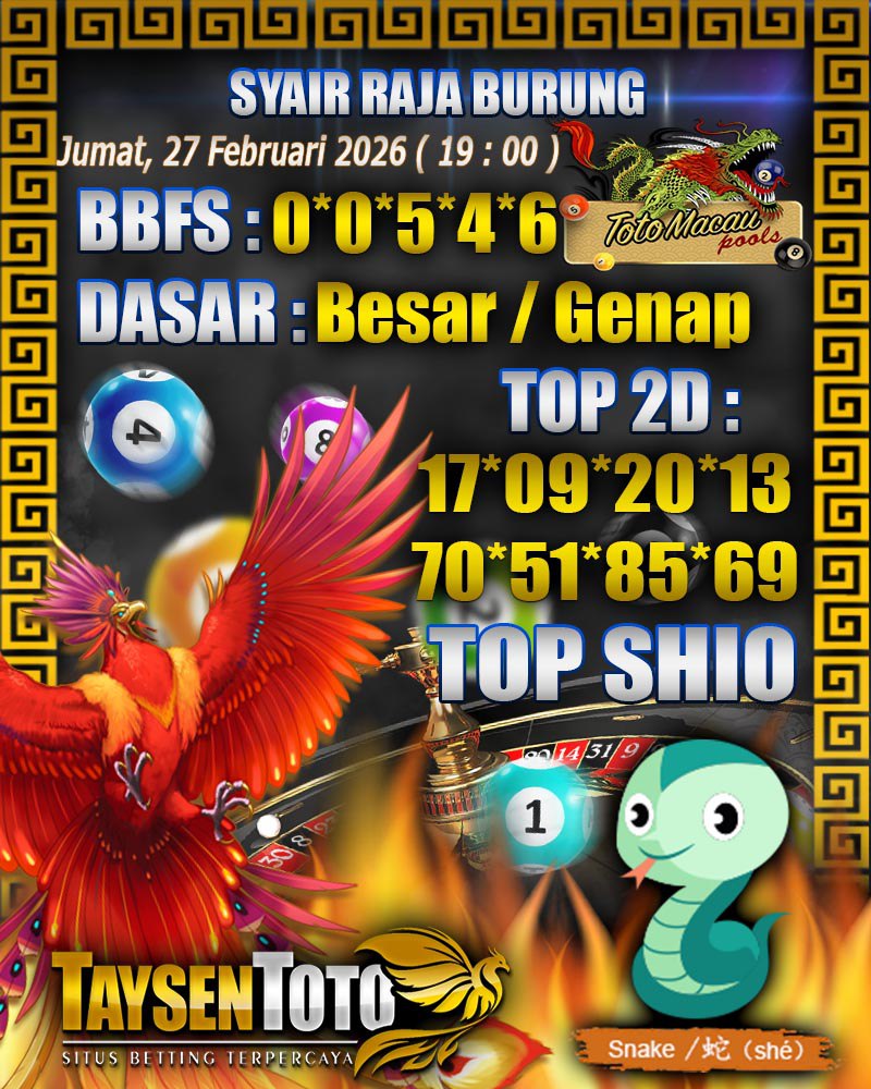 Syair Raja Burung Toto Macau Hari Jumat, 27 Februari 2026| 19 : 00 WIB
