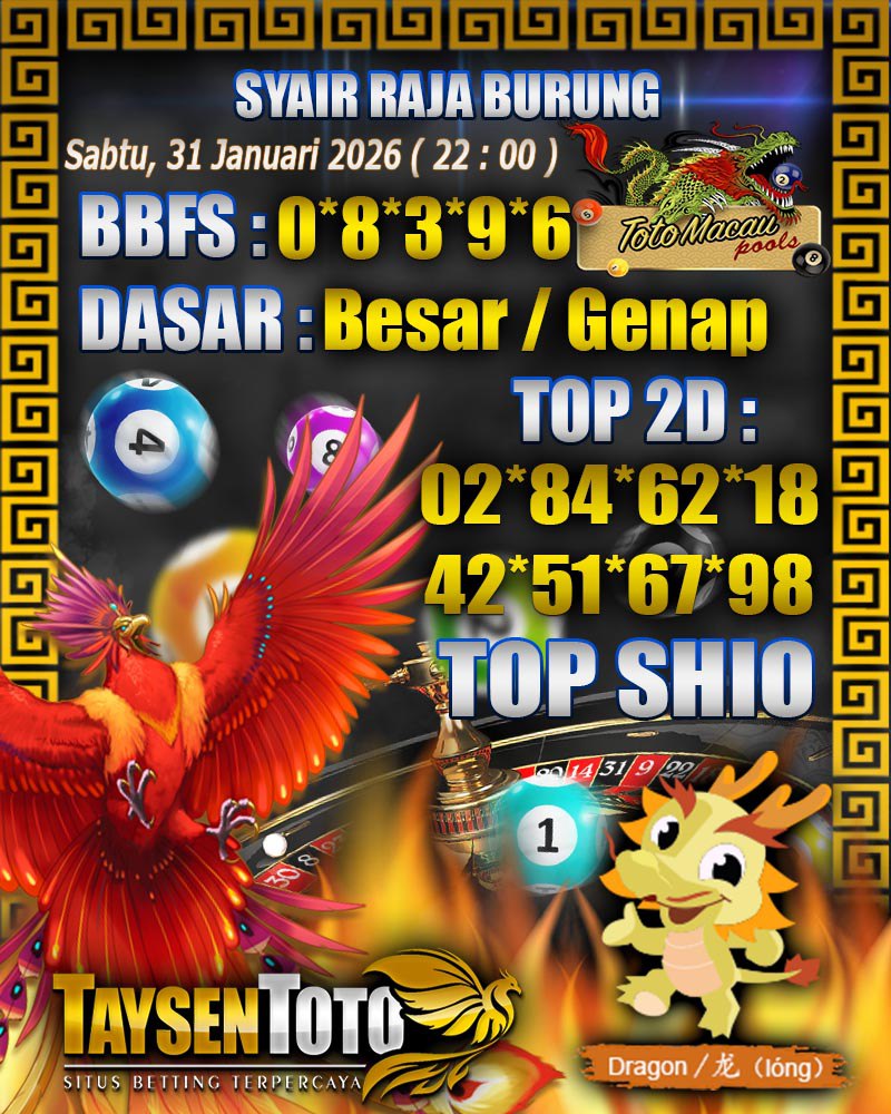 Syair Raja Burung Toto Macau Hari Sabtu, 31 Januari 2026| 22 : 00 WIB